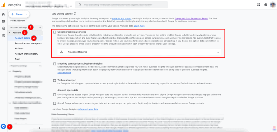 This setting is only relevant if you use other Google products and want to link them to your Google Analytics account. In order to minimise data, you should think carefully about which other Google products you really need and to which you share your data from Google Analytics. Please note that if you use product links, you should make this transparent to your website visitors in your privacy policy and in the cookie banner.