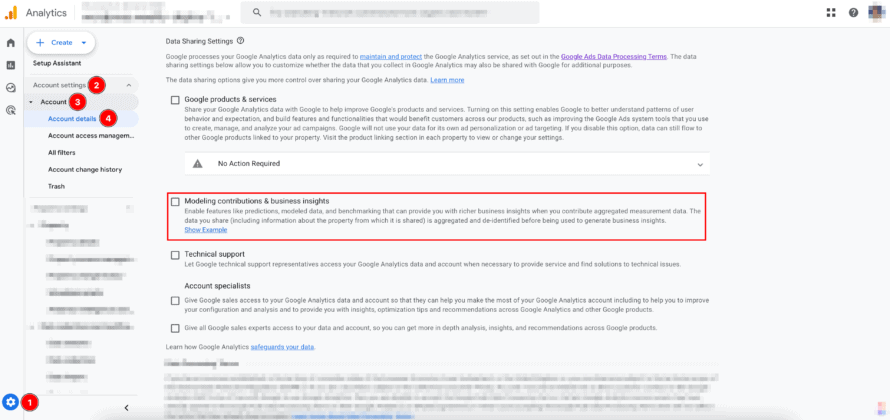 📍Admin (gearwheel) > Account settings > Account > Account details > Data sharing settings > Modeling contributions & business insights