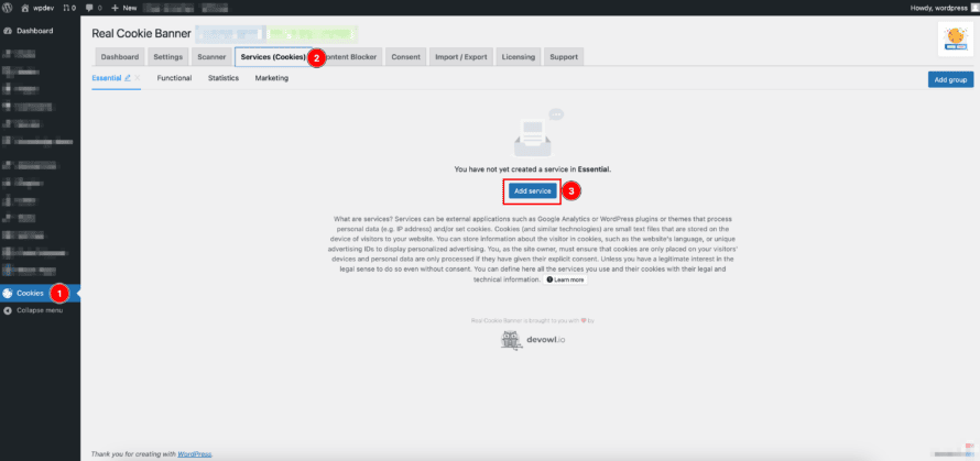 1. Navigate in your WordPress backend to Cookies > Services (Cookies) and click on “Add service” to create the service.