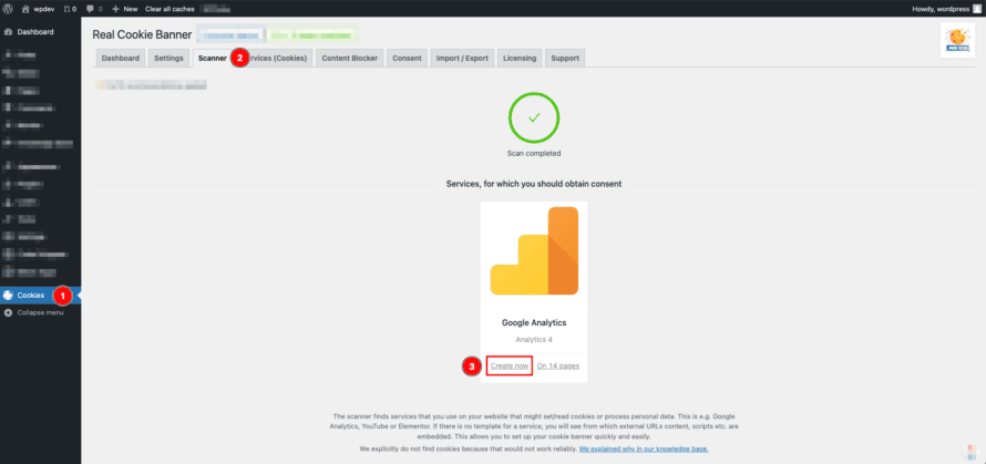 1. Navigate in your WordPress backend to Cookies > Scanner. In the search results, click on the Google Analytics tile (or the plugin that you use for this, such as MonsterInsights) on “Create now” to create the service.