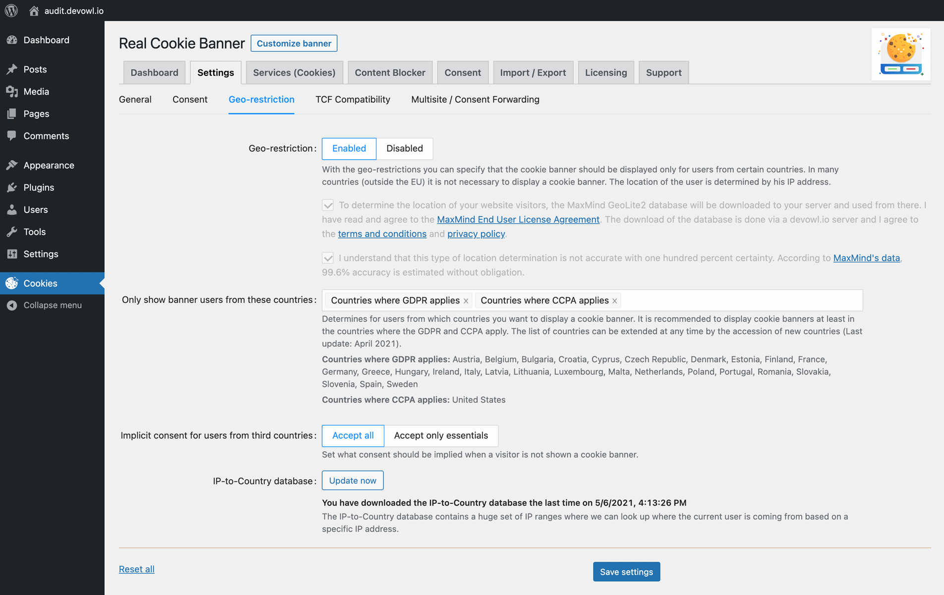 If you run a website aimed at an international audience, you used to have to confront all your website visitors with the cookie consent dialog. Even if, according to the law in their country, you wouldn’t have needed consent at all. Geo-restrictions solves this problem for you. Using an IP-to-country database stored locally in your WordPress, Real Cookie Banner can now determine which country your visitor is from based on their IP address. You can determine per country if a cookie banner should be displayed. If no cookie banner is displayed, you can also determine which consent should be implied.