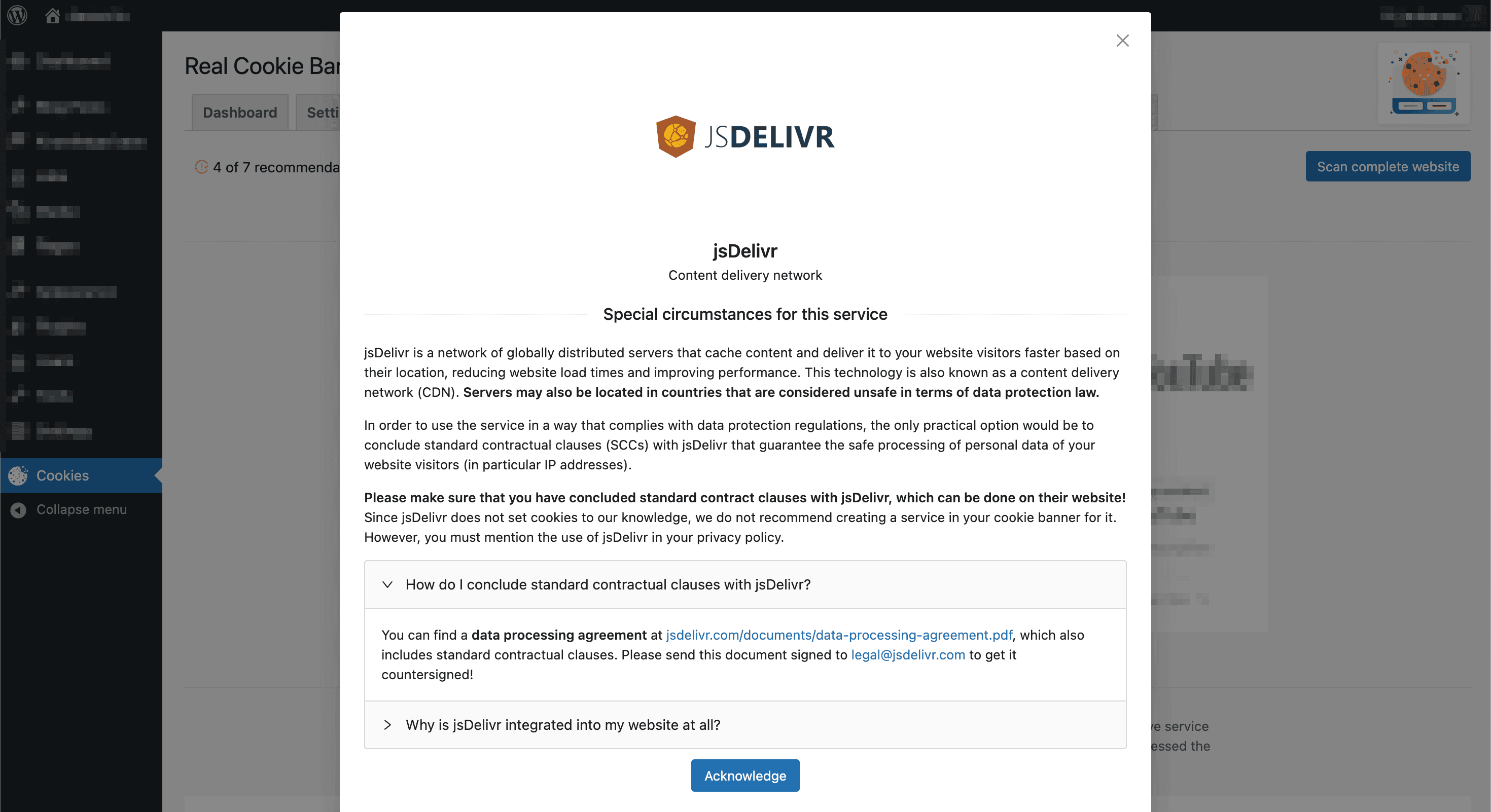 In the latest version of Real Cookie Banner, CDNs are now automatically detected by the scanner. We have comprehensively analyzed the legal situation for the 17 most commonly used CDNs and offer you step-by-step instructions directly from the scanner. This enables you to take all the necessary measures to use the CDN on your website in a privacy-compliant manner. This way, you can benefit from the advantages of a CDN while remaining legally on the safe side in the EU!