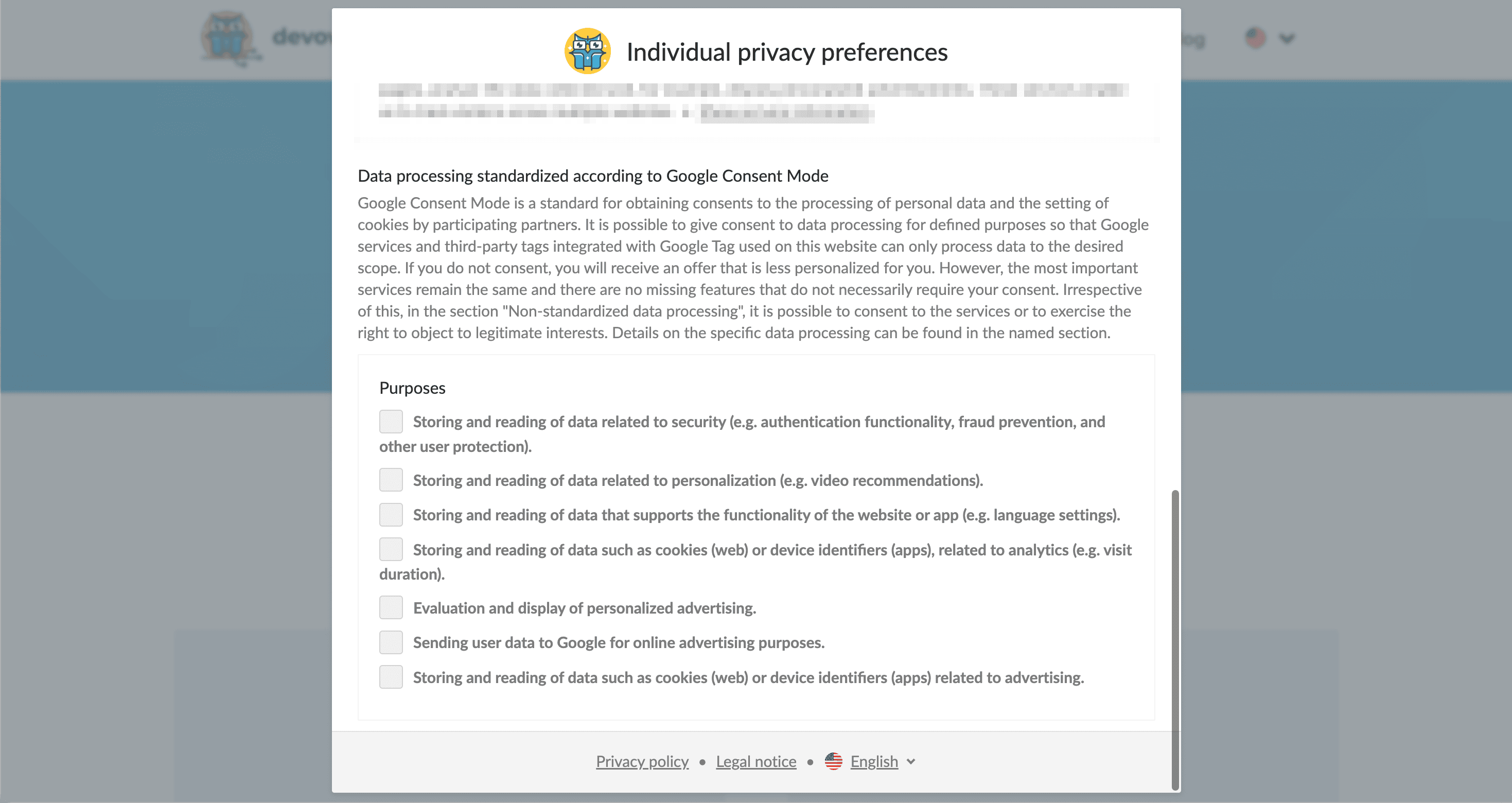 Real Cookie Banner supports the Google Consent Mode v2, which is currently necessary to fulfill the legal requirements. We have placed a strong emphasis on ensuring that the information requirements under Art. 13 GDPR are met. Website visitors also have the right to freely consent to the individual processing purposes in accordance with the requirements of the GDPR. Many alternative solutions overlook this important point and do not offer a real choice, because Google has been very imprecise in its communication with cookie banner providers. In addition, the Advanced Consent Mode suggests that data like Google Analytics can be processed (limited) without explicit consent.