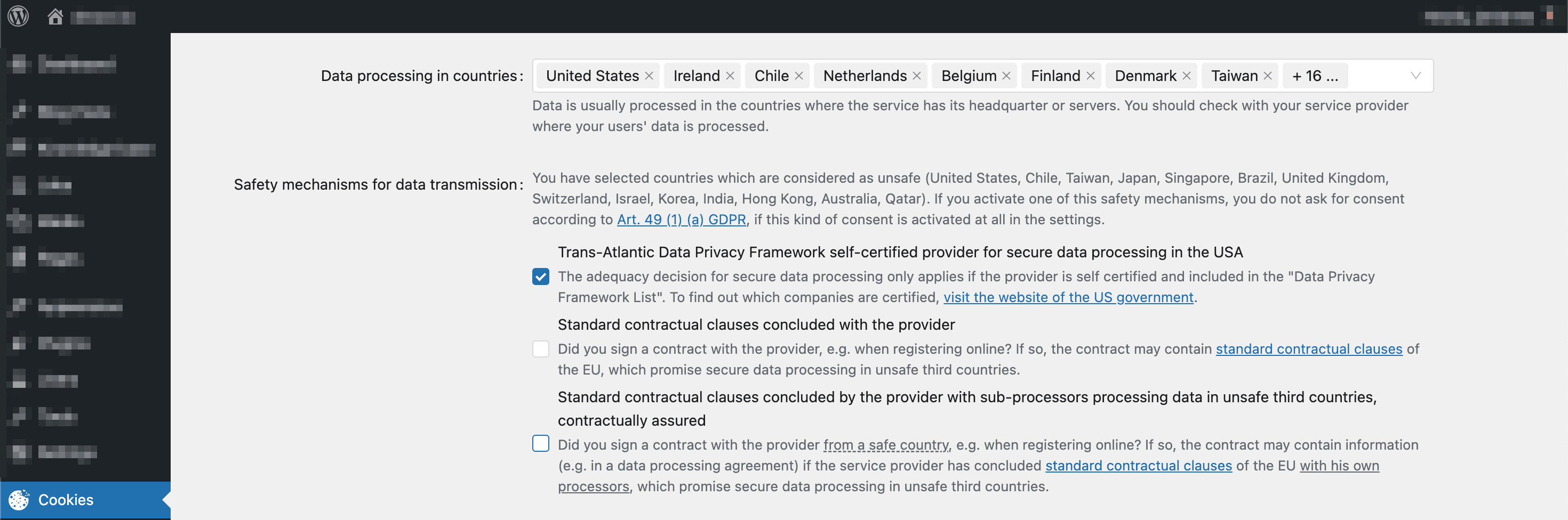 You can specify in your WordPress backend under Cookies > Services (Cookies) > [add/edit service] in the “Data processing in countries” field, in which countries the service provider processes data and then specify in the “Safety mechanisms for data transmission” section which appropriate safeguards have been (or will be) taken.