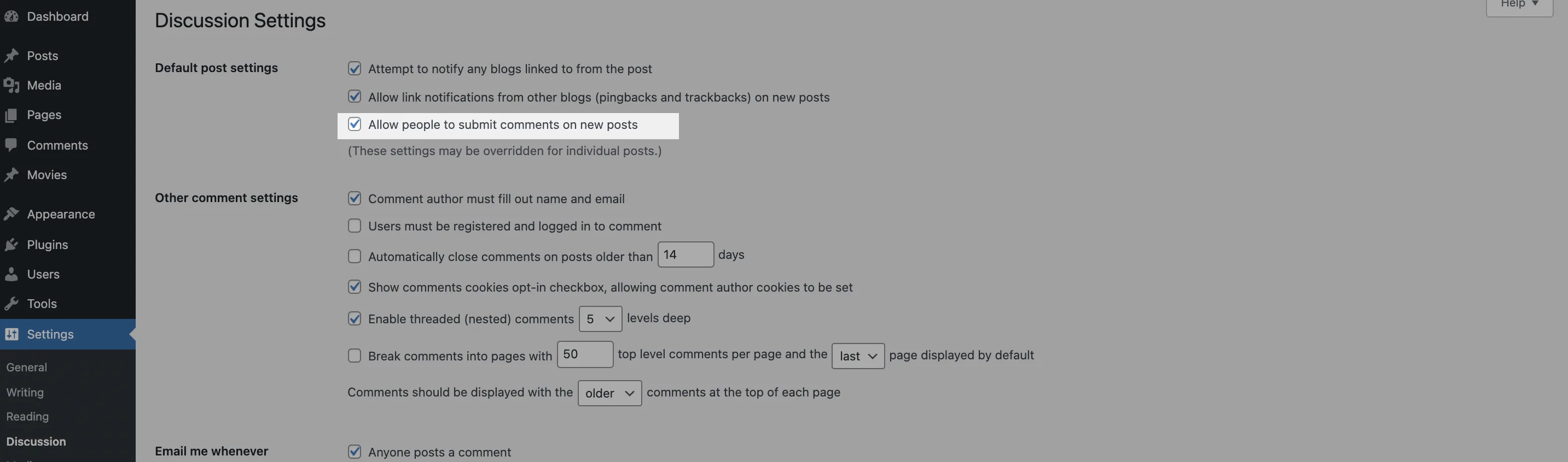 - Go to Settings > Discussion in the menu on the left.