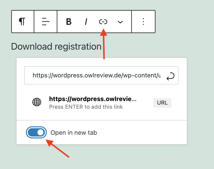 - Write the text you want the visitor to click on to go to the download. In our example, this is called Download registration.