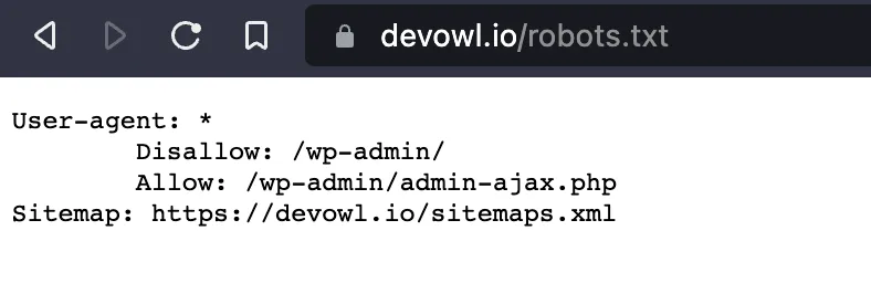 User-agent: *: This specifies which bots and crawlers are allowed to search the website. The asterisk (*) means that all bots/crawlers have access. Alternatively,User-agent:Googlebot could be entered here so that only the Google Bot searches the website.Disallow: /wp-admin/: In Disallow you define which directories, pages and files are not allowed to be read by the bots/crawlers defined in the user agent. In our case, these are pages that begin withdevowl.io/wp-admin/– i.e. the admin login. If instead of/wp-admin/there is simply /, this would mean that no directory may be searched. If you enter nothing afterDisallow:, all pages will be crawled.Allow: /wp-admin/admin-ajax.php: Allow all bots to search the specific PHP file. Again, the page name must match the one displayed in the browser.Sitemap: https://devowl.io/sitemaps.xml: In some cases – like ours – you will also find a sitemap entry in therobots.txtfile. This entry tells you where exactly you can find the sitemap of the corresponding website. You can copy the link and paste it into a new tab. All URLs of a website are listed in an XML sitemap.