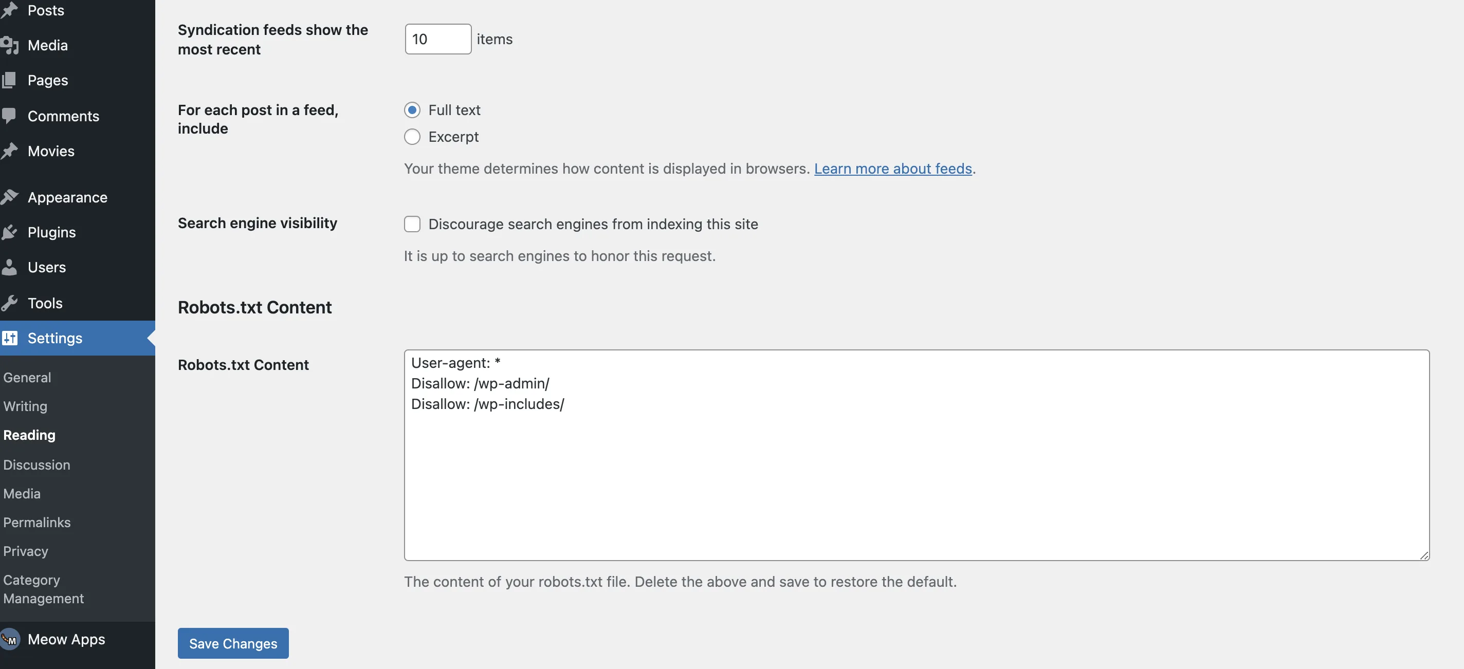 The plugin is free of charge. After installation, you will find it on the left in the menu bar under Settings > Reading. If you scroll down here, you will find the Robots.txt Content entry. Here, you can edit the robots.txt file in WordPress. You can enter the code we generated in the previous step in the corresponding field. Don’t forget to save the changes afterwards.